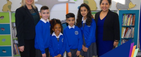 Pictured are Jo Higgins, our Chief Executive, with Surinder Sehmbi, headteacher of Blowers Green Primary, and some of her pupils.